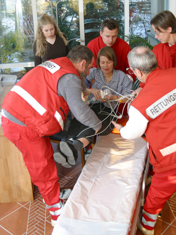 In dieser Situation kommt vom Roten Kreuz ein  besonderer Vorschlag: ob ich nicht selber einmal in die Rolle einer Notfallpatientin schlüpfen wolle. Diese Idee gefällt mir –  gleichzeitig spüre ich ein leichtes Flattern im Bauch – und ich stimme zu. Wir beschließen, einen für den Rettungsdienst typischen Notfall zu simulieren: den Verdacht auf einen Herzinfarkt. Alle haben grünes Licht für unser Projekt gegeben: die Rettungswache – dort ist der Rettungswagen stationiert, die Notärztin und das zuständige Krankenhaus.