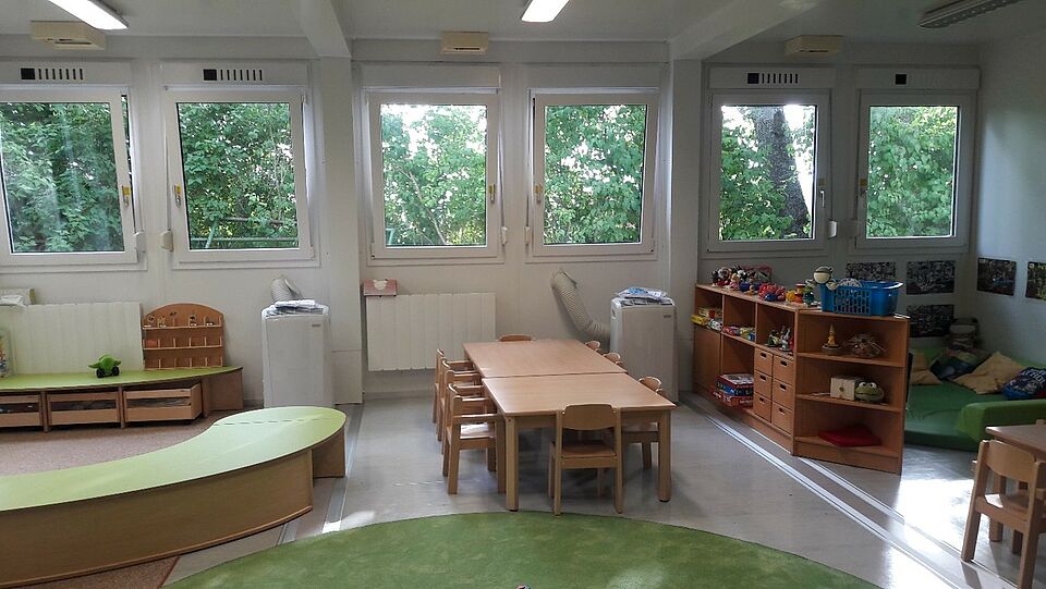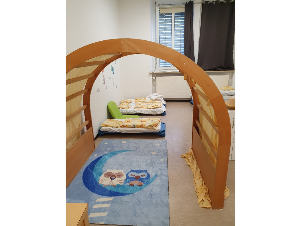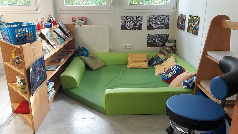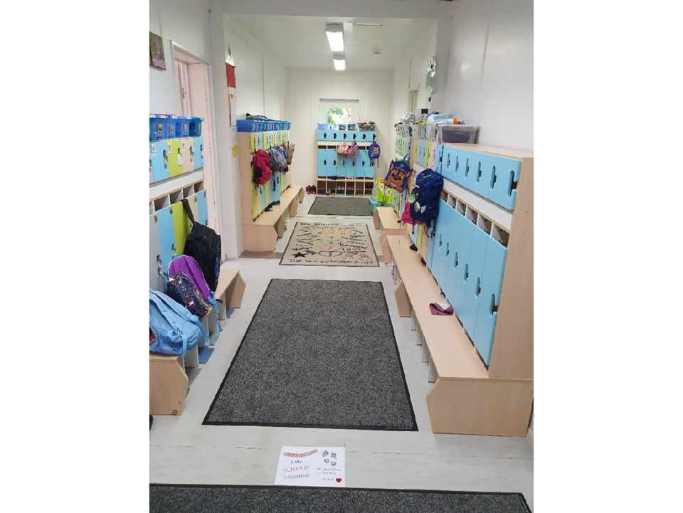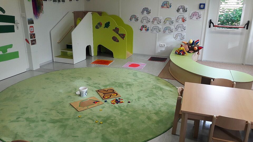 Im Container nebenan befinden sich die Bienen- und Fröschegruppe. Diese besitzen ebenfalls ein Nebenzimmer und ein Bad. Die Bienen benutzen diesen als Malzimmer und die Frösche als Ruheraum.