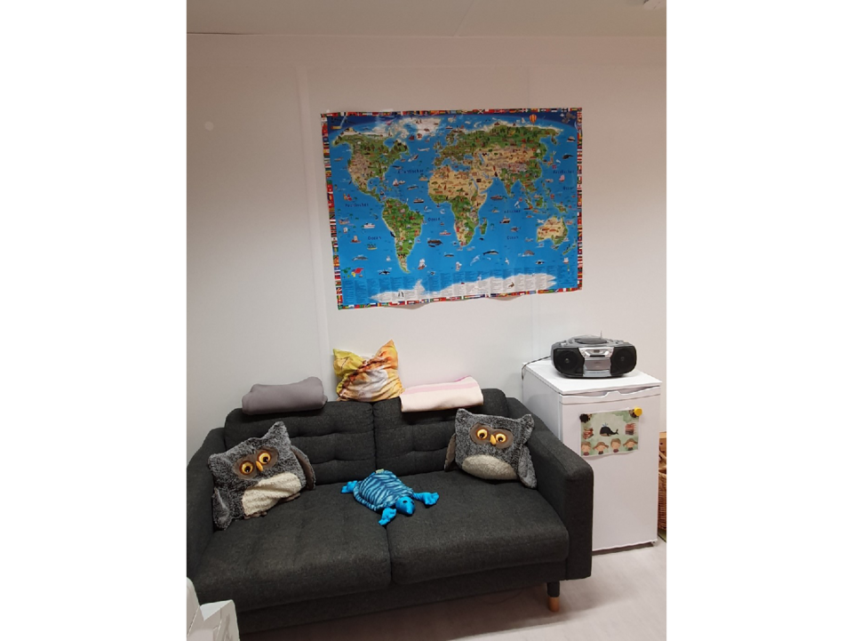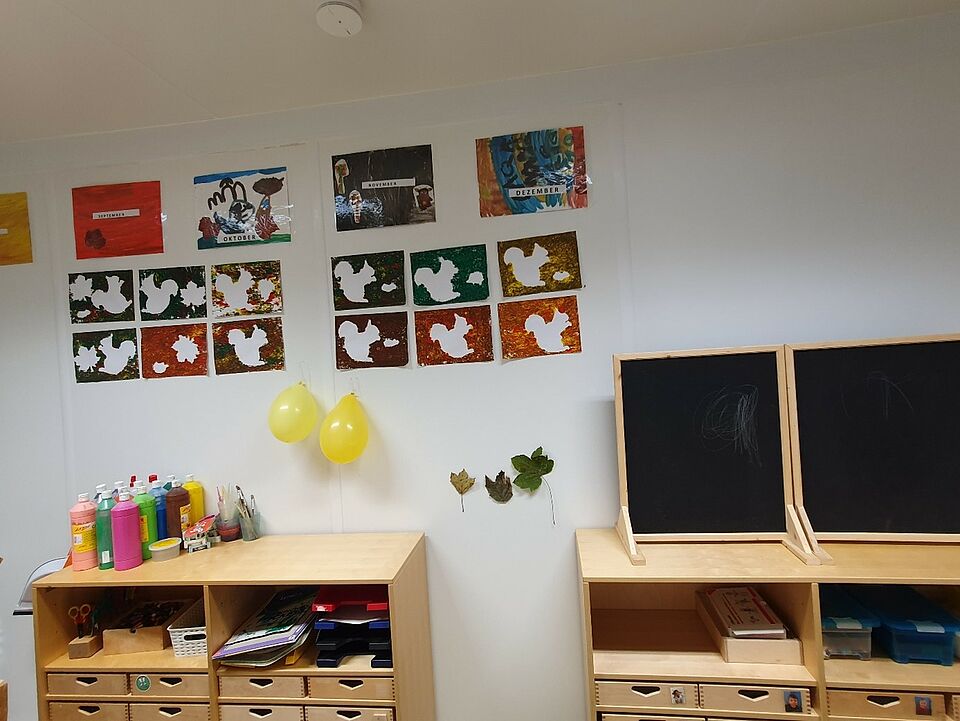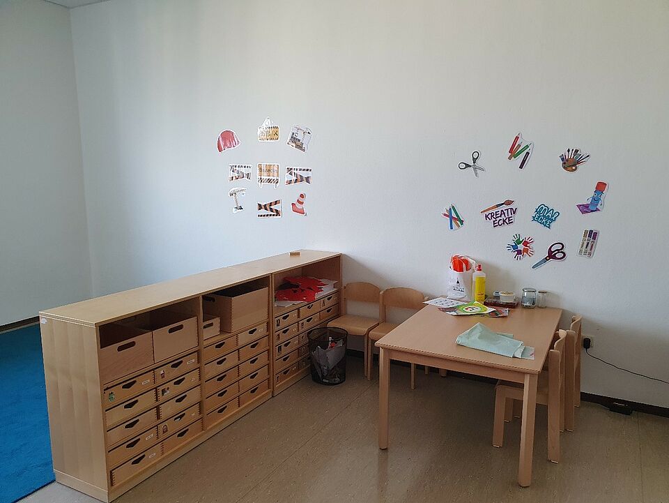 In diesem Zimmer haben die Kinder die Möglichkeit zu Malen und sich kreativ auszuleben. Es stehen ihnen hier verschiedene Materialien zur Verfügung, die sie für ihre Kunstwerke nutzen können.