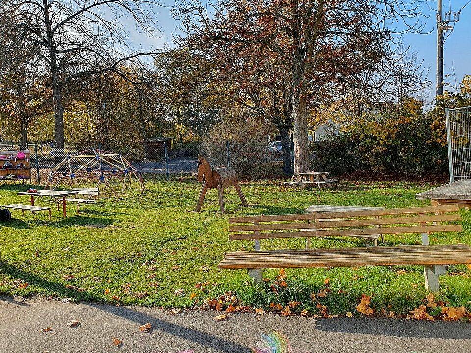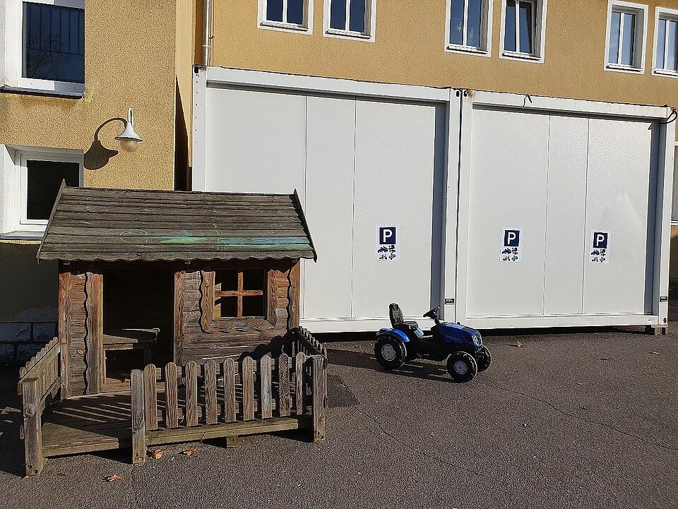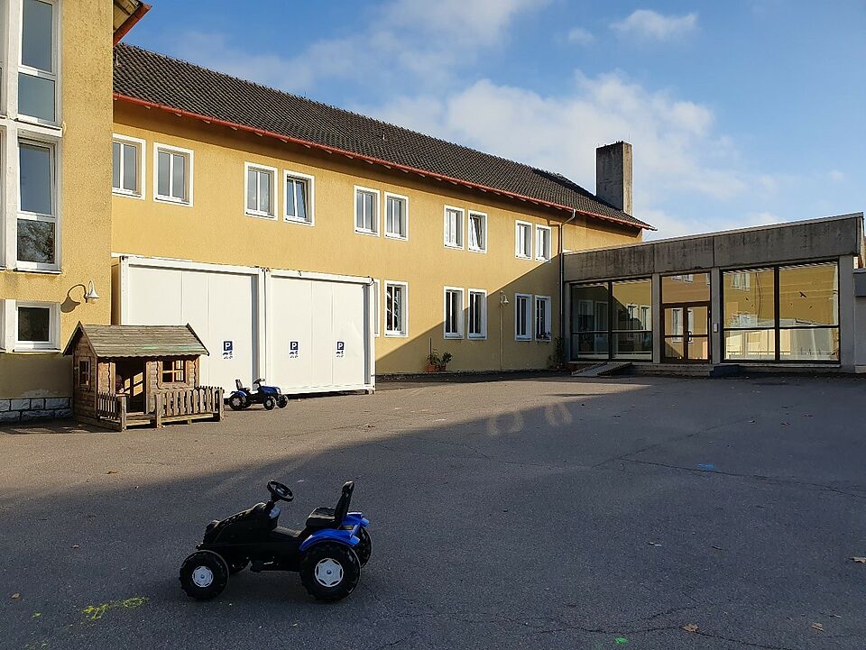 Für die Krippenkinder gibt es einen kleinen Garten hinter der Aula. Dort befindet sich ein Sandkasten und Spielsachen.