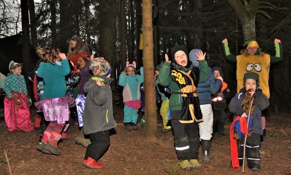 Dort, wo die Regenwürmer husteten, Kinder atemlos durch die Nacht streiften und die Oma im Hühnerstall Motorrad fuhr, waren unsere Faschingsräuber in ihrem Element. Mit lustigen Faschingsmelodien und Gaudispielen tanzten die Kleinen durch den Wald. Nein, frieren tun sie nicht, denn echte Waldkinder kennen sich aus mit frostigen Temperaturen.