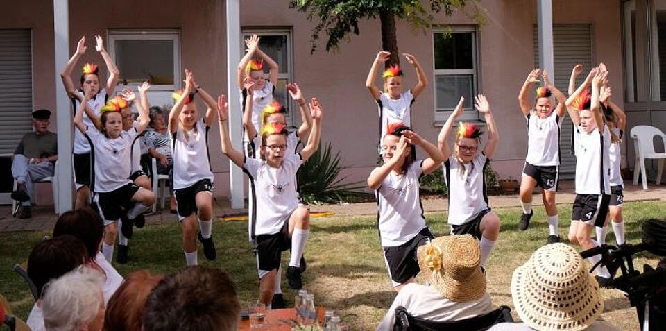 Sie alle erlebten einen unbeschwerten Nachmittag, bei dem es lebendig zuging. Einer, der dazu ganz wesentlich beitrug, war der elfjährige Manuel Pfab. Der selbstbewusste Ehenfelder spielte mit seiner Steirischen im Stile eines Profis auf. Ob Zwiefacher, Brandstein-Boarischer, Sternpolka oder Sterne am Himmel – Manuel glitt gleichermaßen sicher wie begeistert über die Tasten und Knöpfe seines diatonischen Instruments, dies ganz besonders bei seinem Top-Lieblingsstück, dem „Paul und sein Gaul“. Ein weiterer Höhepunkt war der Auftritt der Line-Dance-Gruppe des Hohenburger Frauenbundes unter Leitung von Elisabeth Spörer. Die sechs Damen glänzten mit exakten Schrittkombinationen bei Elvis Presleys „Kiss me quick“ oder „Achy Breaky Heart“ genauso wie beim „Black Coffee“ und beim „Tush Push“. Für das i-Tüpfelchen der Tanzdarbietungen sorgte dann die Kinder- und Jugendgarde. Dem WM-Aus der deutschen Nationalelf zum Trotz traten die Mädchen in deren Trikots und mit schwarz-rot-goldenem Kopfschmuck auf und boten eine fulminante Tanzdemonstration zu Sportsongs wie „Es lebe der Sport“, „Das Ding muss rein“, „Schwarz und Weiß“ oder den Queen-Top-Hit „We are the champions.“ Wie Manuel Pfab und die Line-Dance-Gruppe ernteten sie jede Menge Applaus.