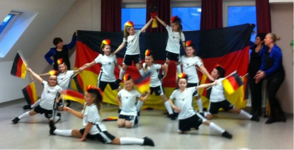Letztere präsentierten souverän ihren Walzer „Tulpen aus Amsterdam“. Regina Merkls Gardemädchen boten in ihren schmucken weiß-blauen Uniformen und erst recht danach in den Trikots der deutschen Fußball-Nationalmannschaft ein rasantes Tanzprogramm. Sie wirbelten zunächst zu Vader Abrahams Schlümpfe-Song über das Festsaalparkett. Absolutes Highlight war ihr Showtanz. Unter dem Motto „Ein Hoch auf uns“ boten die Gardemädchen eine fulminante Tanzdemonstration zu Sportsongs wie „Es lebe der Sport“, „Das Ding muss rein“, „Schwarz und Weiß“ oder den Queen-Top-Hit „We are the champions.“ Da die im Haus wohnenden Rollstuhlfahrer nach wie vor den Festsaal nicht nutzen dürfen, zeigten die Kinder ihr Programm ein zweites Mal eine Etage tiefer im Speisesaal Rot. Überall wurden die Mädchen mit anhaltendem Applaus für ihre Auftritte belohnt.