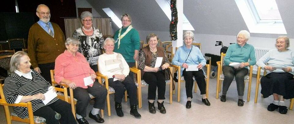 Die sieben Rüstigen unter ihnen fanden sich zur Bescherung zusammen mit Pflegedienstleiterin Patricia Kugler im Festsaal des Heimes ein. Ihnen konnten Anton Eisert und Erna Brauner Gutscheine für einen Frisörbesuch bzw. eine Fußpflegemaßnahme überreichen. Zudem wies Eisert darauf hin, dass man auch fünf nicht im Barbara-Heim Wohnende mit Warengutscheinen bedacht habe. Derartige Aktionen gehörten zum sozialen Selbstverständnis der VdK. Die